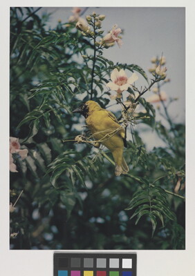 u.l. [stamp]: PHOTOGRAPH \ By \ ELIOT PORTER \ No. [in ink]: Rol 75, No 8 \ [stamp]: Title [in ink]: Weaver Finch, Masked \ Queen Elizabeth Park \ Uganda 1970