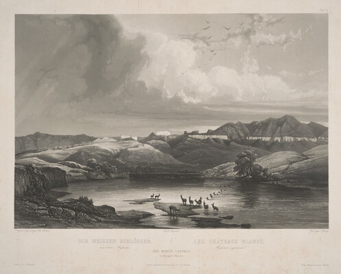l.c.:Imp. de Bougeard \ DIE WEISSEN SCHLÖSSER LES CHÂTEAUX BLANCS \ am obern Missouri Missouri supérieur \ THE WHITE CASTELS \ on the upper Missouri \ London, published by Ackermann & Co. 96 Strand \ [blind stamp]