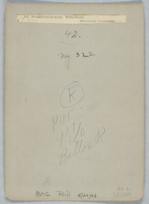 u.l. to u.r. printed on paper label: 111. WHOAK-POO-NO-BATS. White Shield. \ SOUTHERN CHEYENNE.