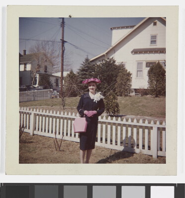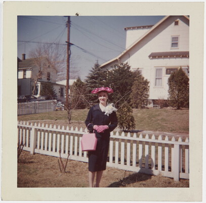 [Woman in black dress with pink hat, gloves, and purse]