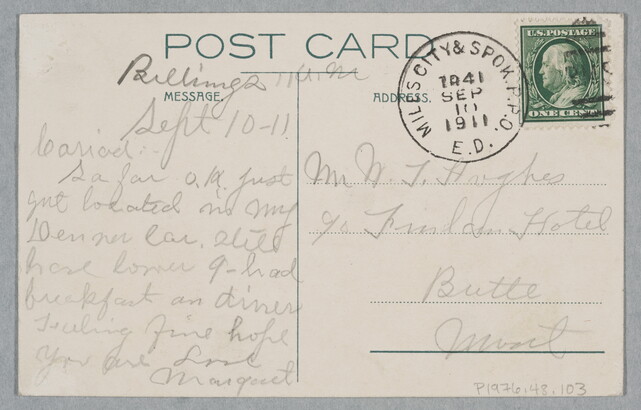 c. to l.r. in graphite: Mr. W.J. Hughes \ c/o Findan Hotel \ Butte \ Mont
