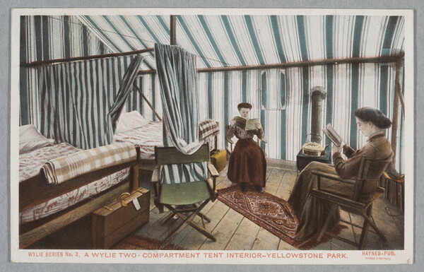 l.l. to l.r. printed in red, below image: WYLIE SERIES No, 3, A WYLIE TWO - COMPARTMENT TENT INTERIOR - YELLOWSTONE PARK. HAYNES - PUB. \ Printed in Germany.