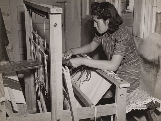 [Young girl at loom, weaving]