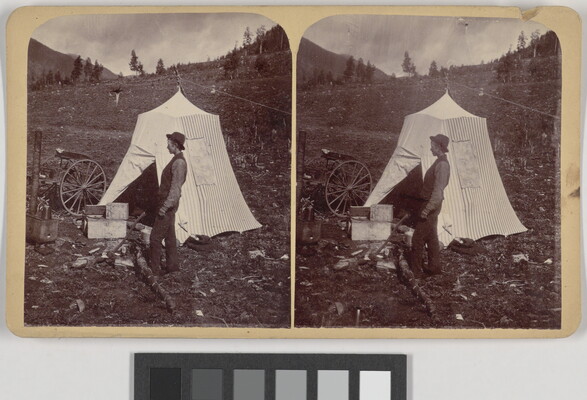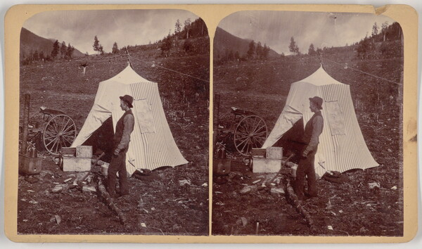 [Young man near tent, axe, and wagon]