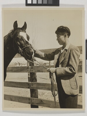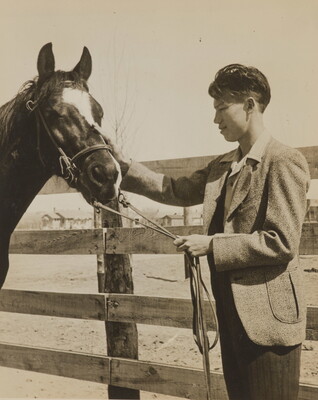 [Young man in wool jacket holding reins of horse]