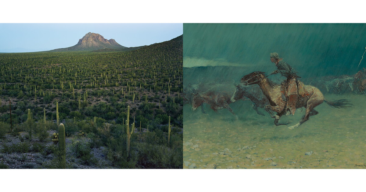 Images (left to right): Mitch Epstein (b. 1952), Ironwood Forest National Monument, Arizona 2018, dye coupler print, © Black River Productions Ltd. / Mitch Epstein. Courtesy of Sikkema Jenkins & Co., New York; Frederic Remington (1861–1909), The Stampede, 1908, oil on canvas, Gilcrease Museum, Tulsa, OK, Gift of the Thomas Gilcrease Foundation, 1955, 0127.2329