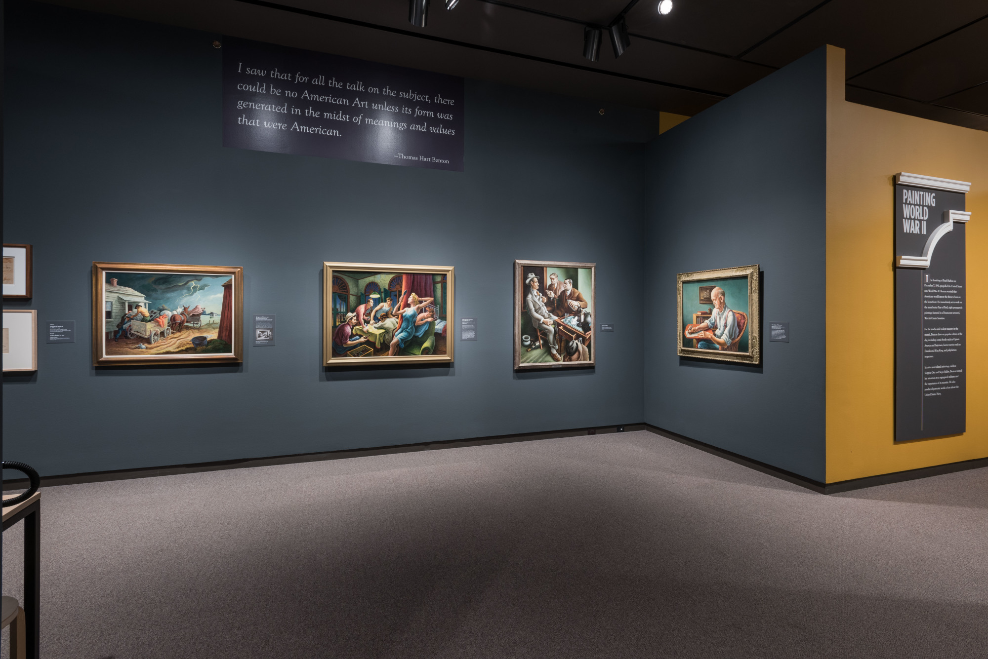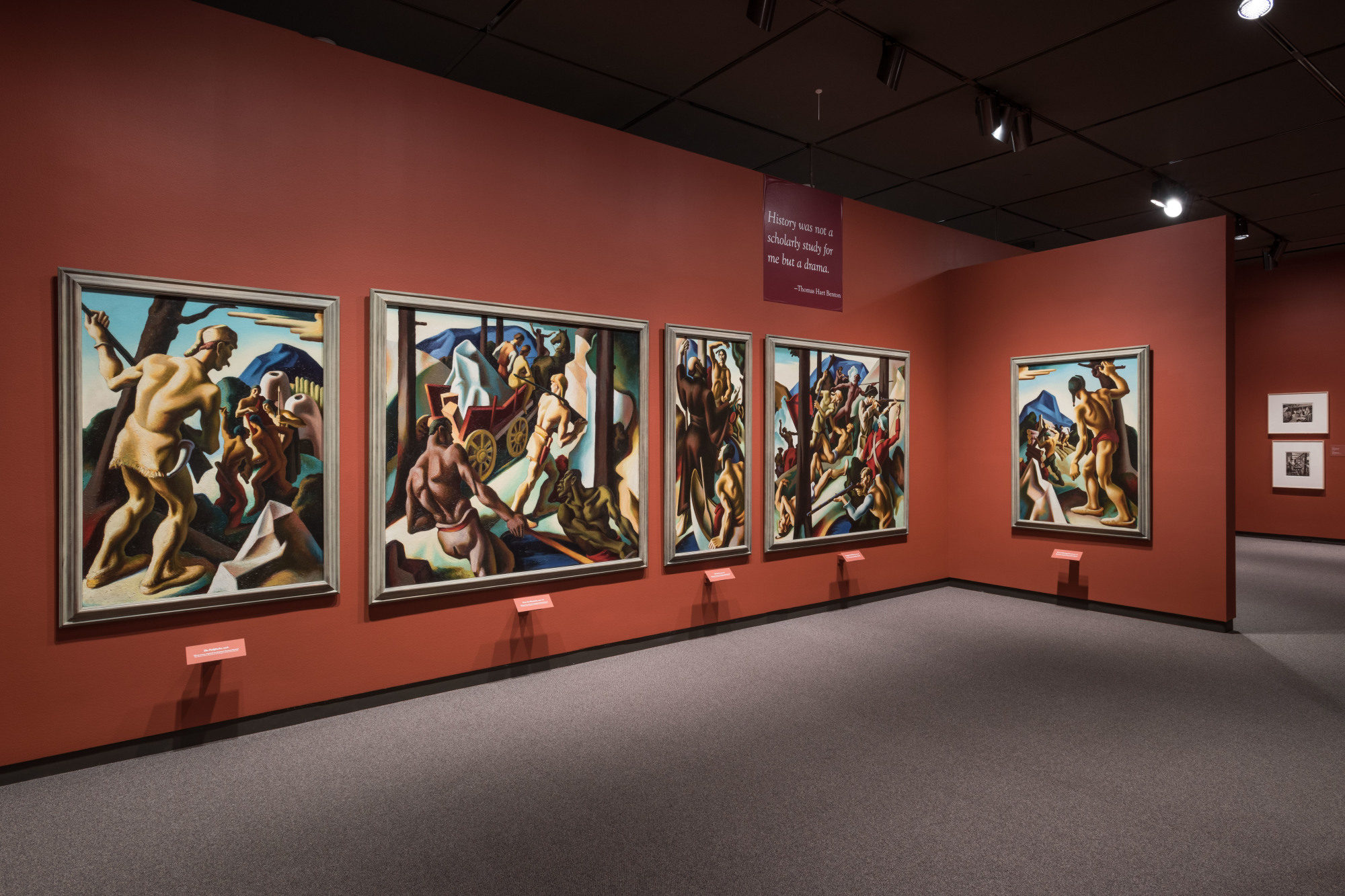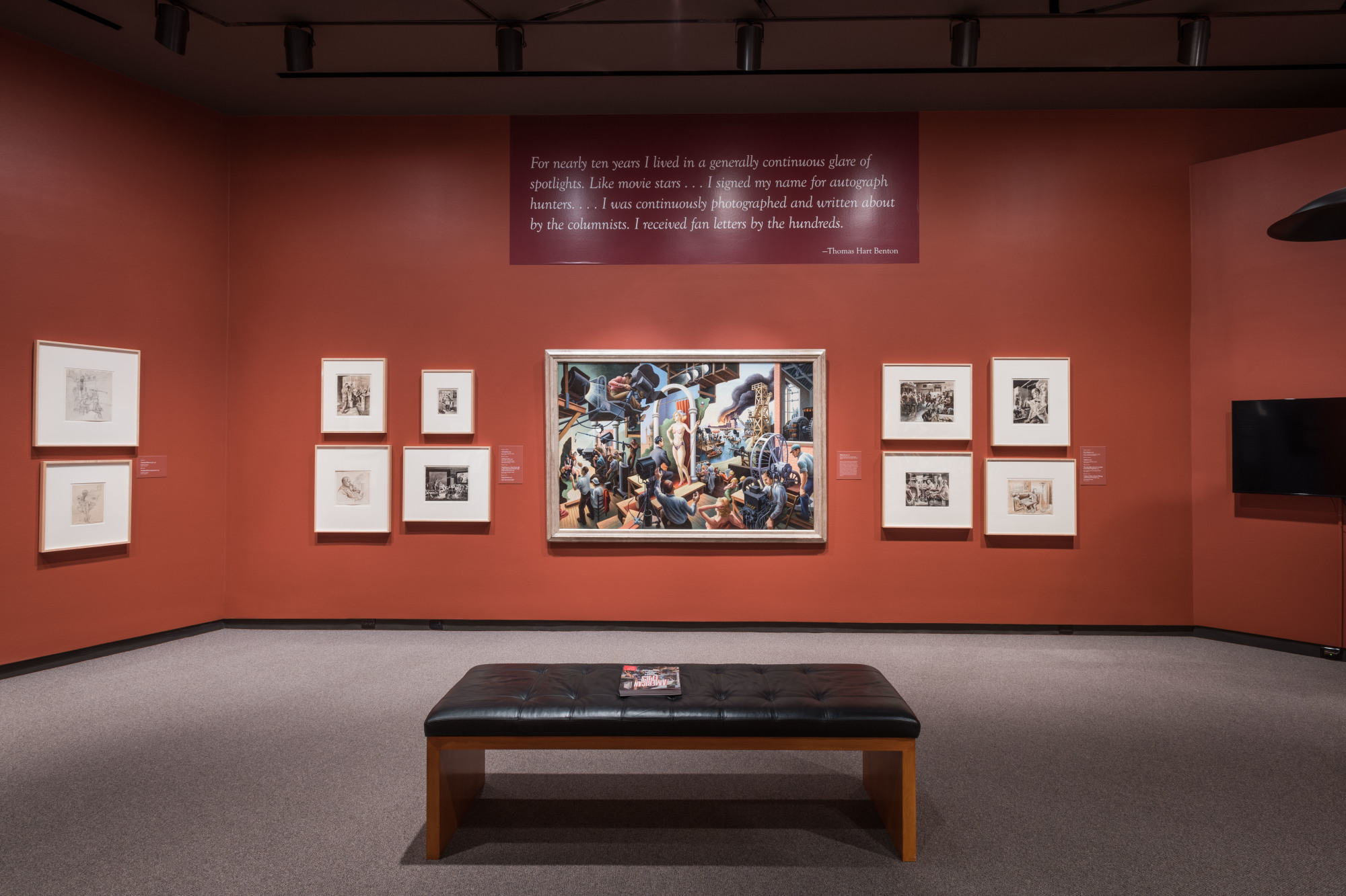 Benton’s associations with the film industry began on the silent film sets of Fort Lee, New Jersey—the first “Hollywood”—and extended to an intimate career-long association with Hollywood’s movers and shakers. His awareness that movies were the best and most popular means of telling American tales inspired a signature artistic style that melded centuries-old traditions with movie-production techniques to create images that appealed to a broad range of Americans.
