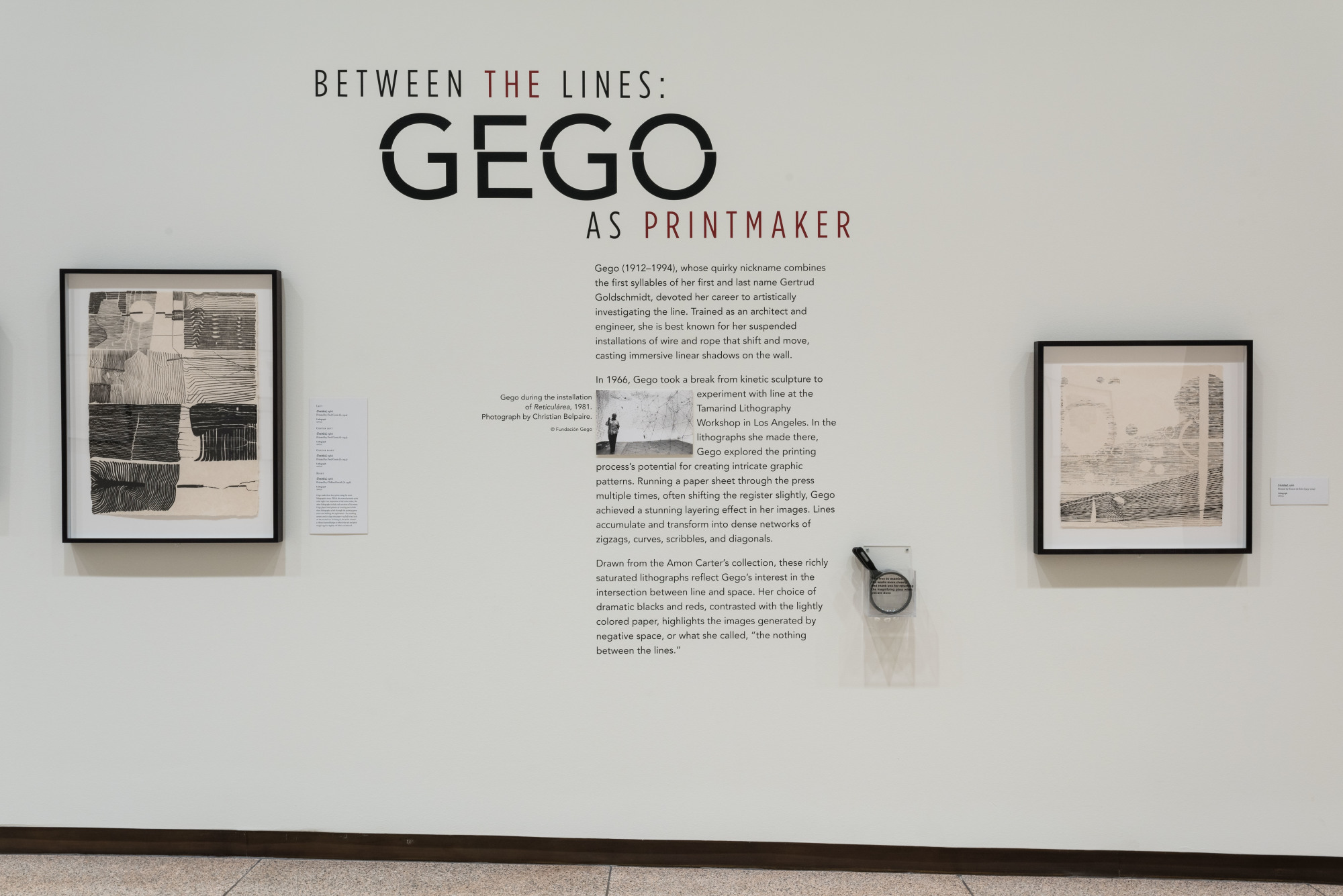 Drawn from the Carter’s collection, these richly saturated lithographs reflect Gego’s interest in the intersection between line and space. Her choice of dramatic blacks and reds, contrasted with the lightly colored paper sheet, highlights the images generated by negative space, or what Gego called “the nothing between the lines.”