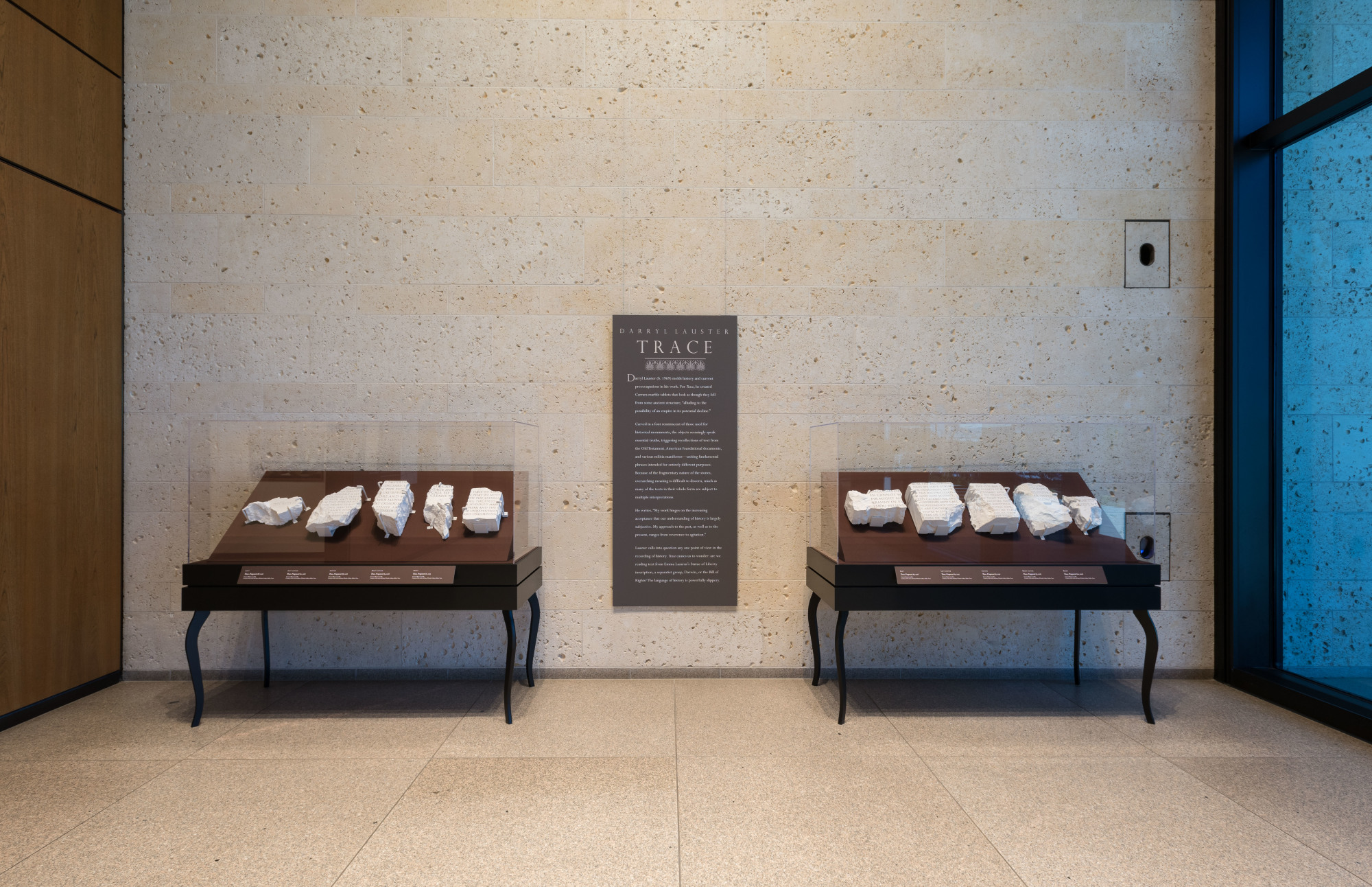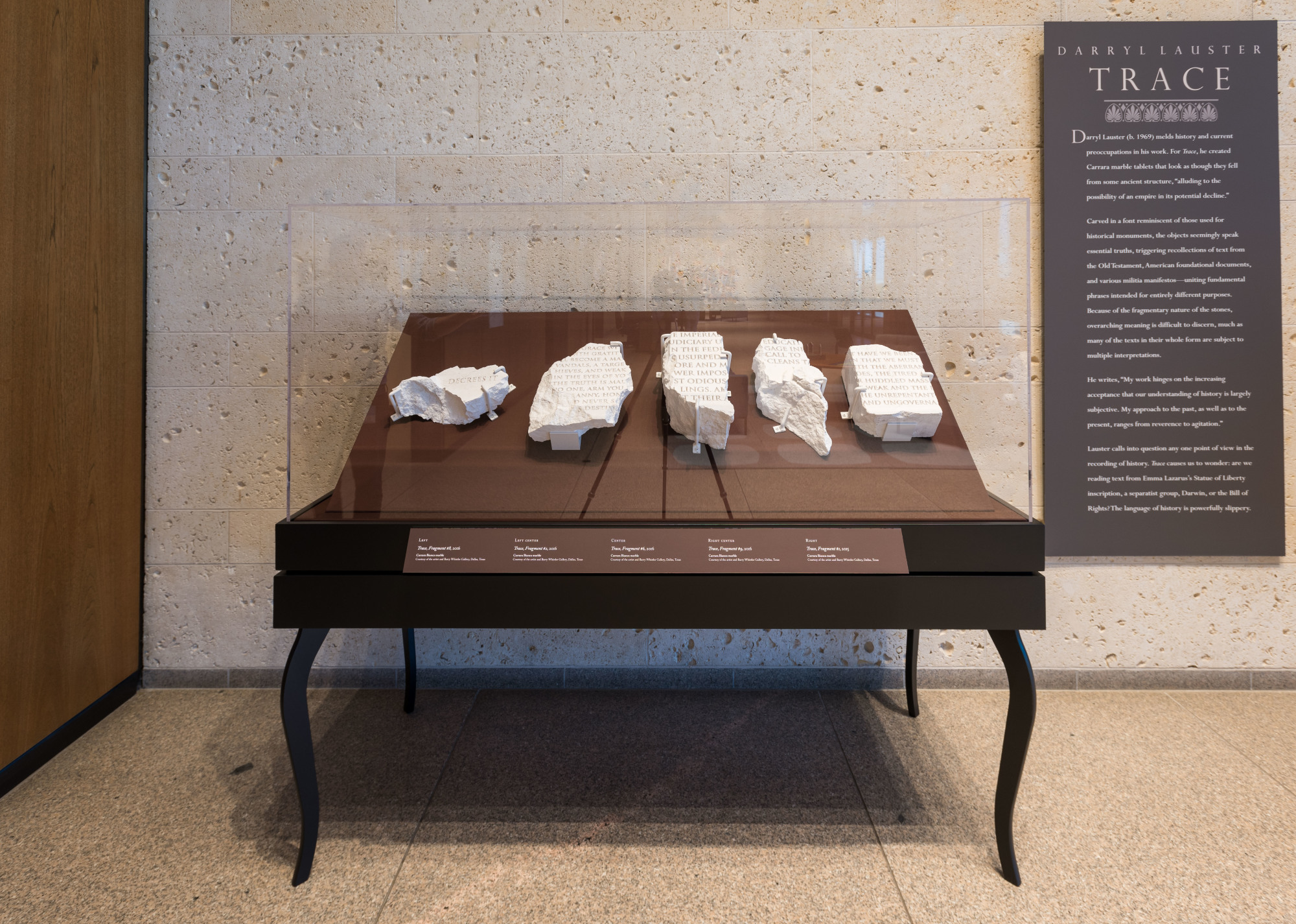 For his sculptural installation Trace, Texas-based artist Darryl Lauster created 10 fragmentary Carrara marble tablets and carved phrases in them using a font reminiscent of monuments. The blocks of stone convey what seem like essential truths—such as language from American founding documents, various militia and splinter group manifestos, and parts of the inscription on the Statue of Liberty—uniting fundamental phrases intended for entirely different purposes and obscuring their original meanings. Because the stones appear to be broken pieces of a full inscription, any overarching meaning is difficult to discern, much as many of the texts in their entirety are subject to differing interpretations. They seem to have fallen from an ancient building, as he remarks, “alluding to the possibility of an empire in its potential decline.”