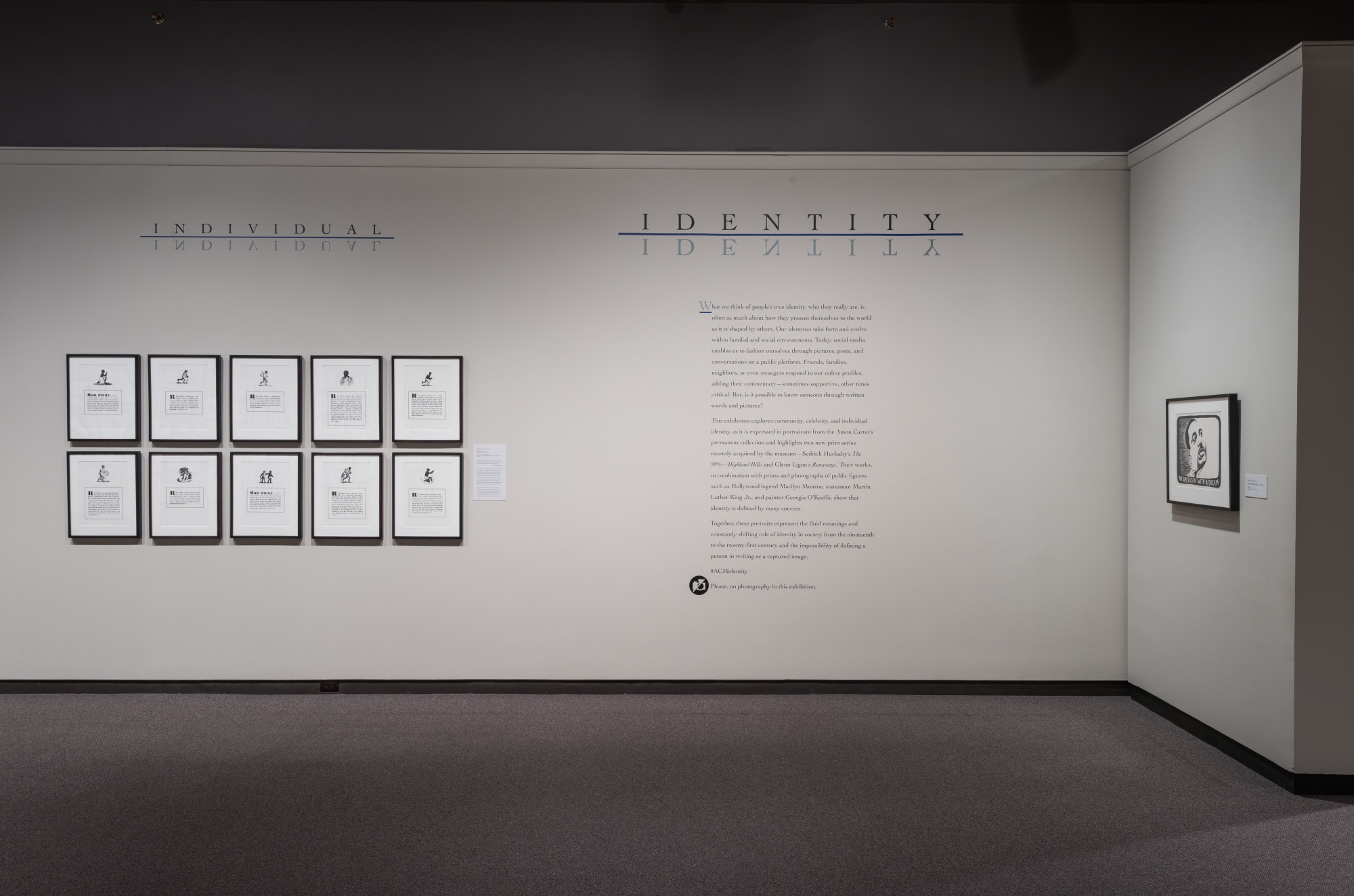 Identity explores how identity in American culture is often as much about how people present themselves to the world as it is externally determined. Exploring community, celebrity, and individual identity through portraiture from the Carter’s permanent collection, the exhibition highlights the exciting new acquisitions of Sedrick Huckaby’s The 99% and Glenn Ligon’s print series Runaways. Whereas Huckaby engaged with and depicted 101 members of his neighborhood to uncover how their individual personalities were reflective of a larger community identity, Ligon explored the notion that individual identity is often culturally determined. Their works—in combination with prints and photographs of and by public figures such as Hollywood legend Marilyn Monroe, statesman Martin Luther King Jr., and painter Georgia O’Keeffe—show the various personas individuals adopt. Together, these portraits represent the fluid and constantly shifting role of identity in society from the 20th to the 21st century.
