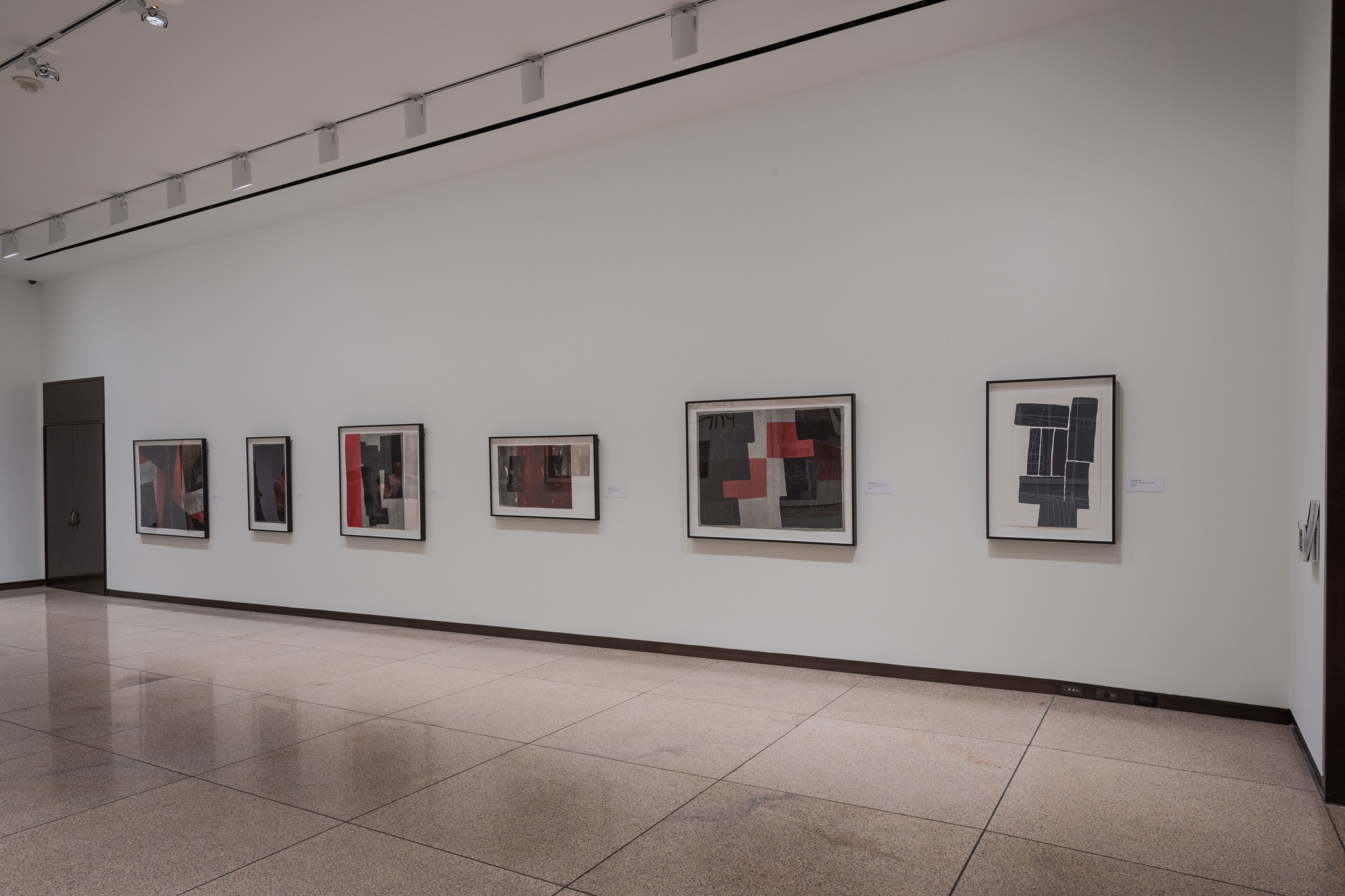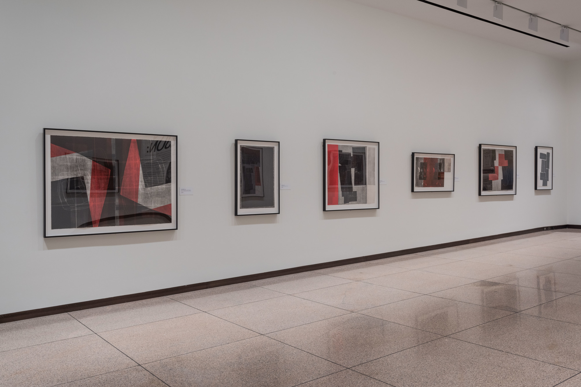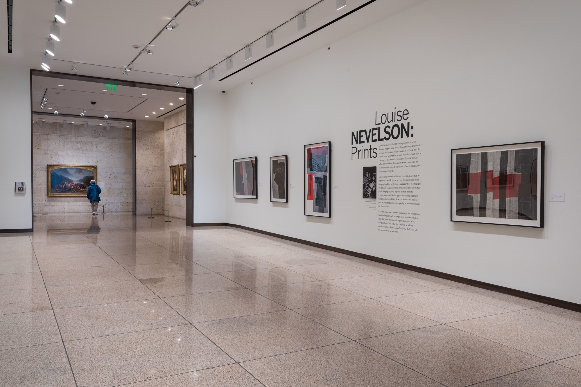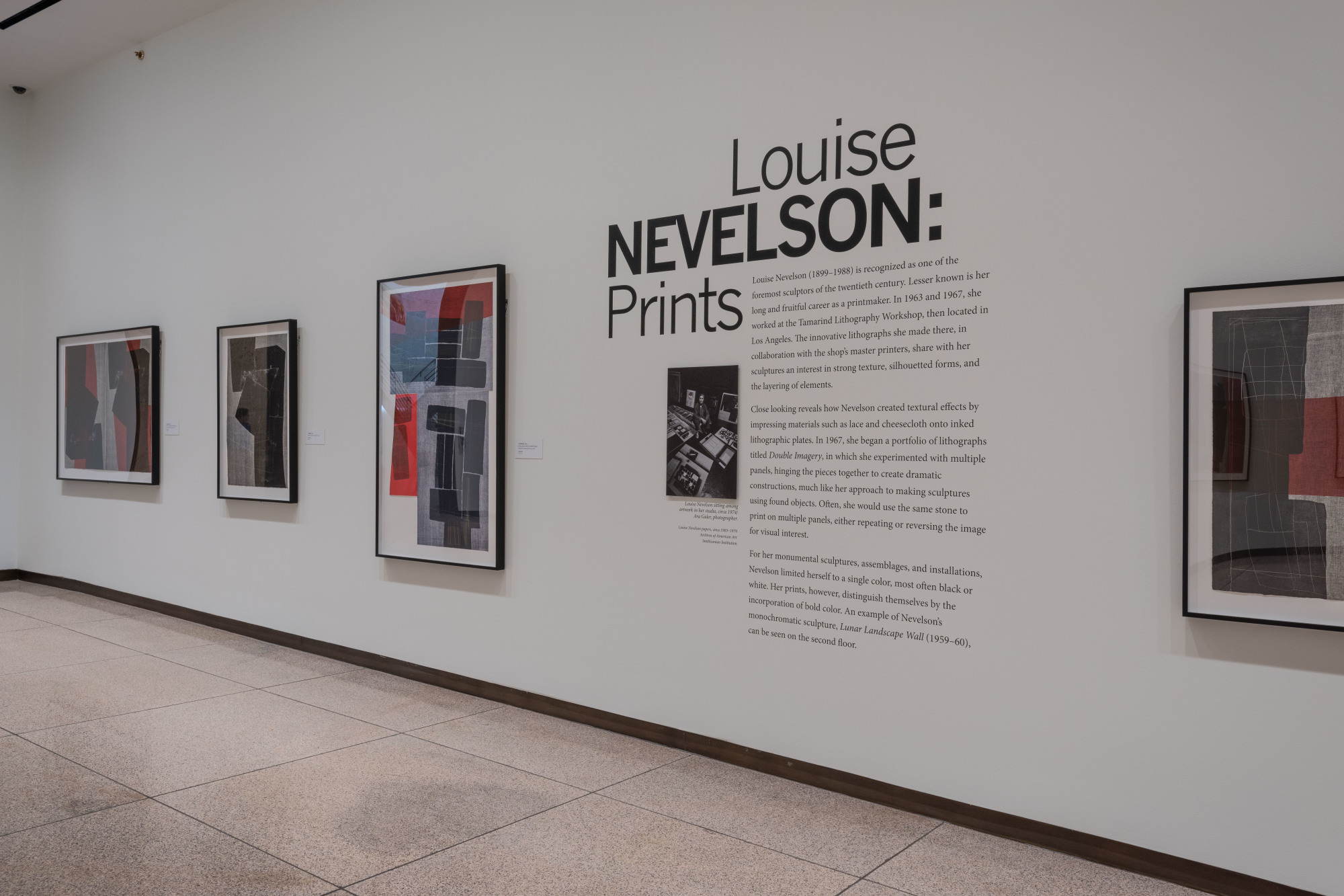 This installation of lithographs features works by sculptor Louise Nevelson (1899–1988) created between 1963 and 1967 at the Tamarind Lithography Workshop in Los Angeles. Nevelson attacked printmaking with many of the same approaches she used to create her sculptures, including her interest in silhouetted forms and layered elements. She created textural effects by impressing materials such as lace and cheesecloth onto inked lithographic stones, producing dynamic, multiple-paneled constructions. While many elements of her lithographic prints are reminiscent of her sculptures, assemblages, and installations, they distinguish themselves completely from the monochromatic pieces by their vivid colors. This exhibition provides a unique glimpse into the experimentations of one of the foremost sculptors of the 20th century.