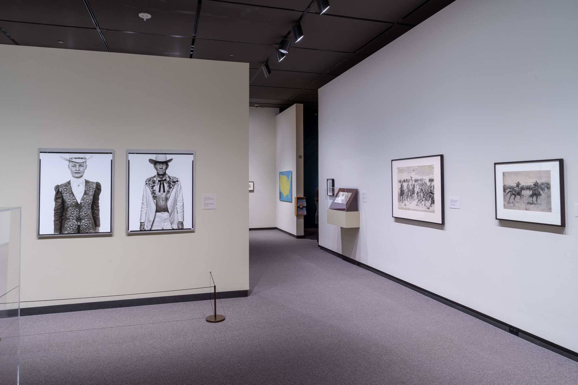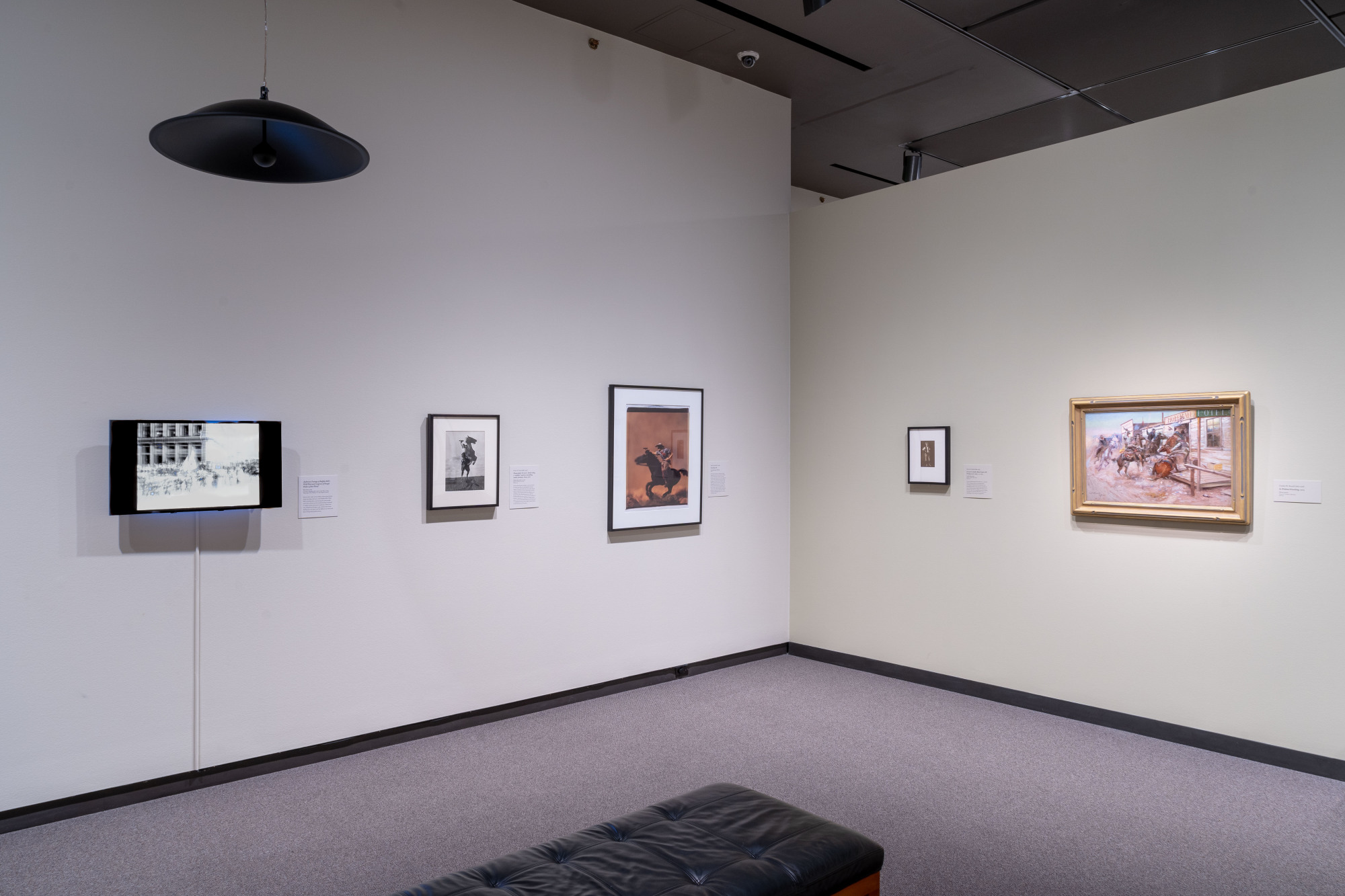 Original posters advertising Wild West shows along with historic photographs of star performers provide a sense of the original outdoor entertainments of the early 20th century. Features of the genre included recreations of wagon trains, attacks by American Indians, and the Pony Express, while skill acts displayed Buffalo Bill and Annie Oakley performing sharp shooting, roping, and riding. The work of historical painters and sculptors like Frederic Remington and Charles M. Russell, as well as contemporary photographers such as David Levinthal, incorporates performance qualities into western subjects. This exhibition reveals the influence of the Wild West shows on these and other artists whose western subject matter gives a nod toward theatricality. In doing so, they expanded—and continue to do so—the deep mythology that imbues the American West.