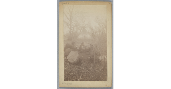 • A sepia-toned photograph of a group of Indigenous people sitting on a grassy hill near their horses.