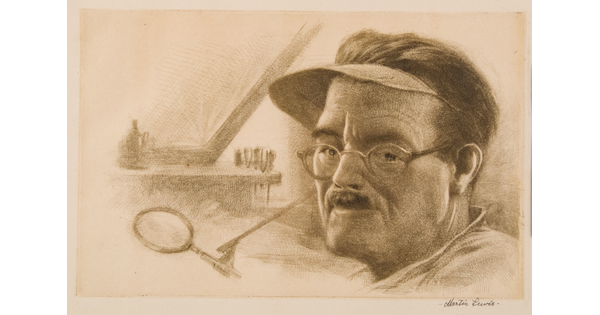 • A black-and-white print portrait of the head of a completely bald, White man, eyes looking to the side.
