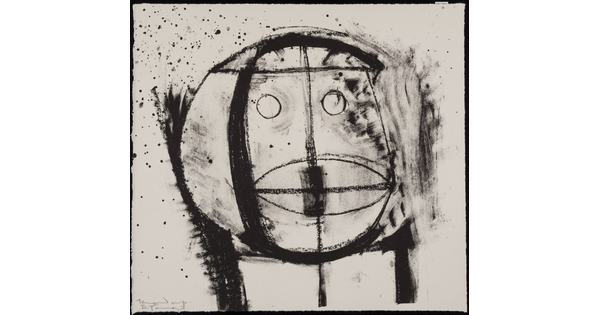 • An abstract black-and-white print of a face on what looks like a hand-held mirror, detailed with fluid lines that bleed into one another.