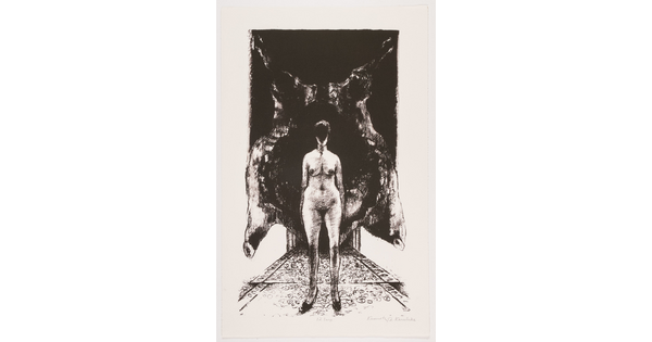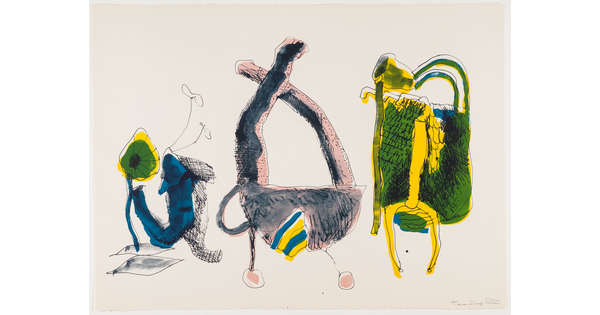 • An abstract black-and-white print of three fantastical creature-like figures.