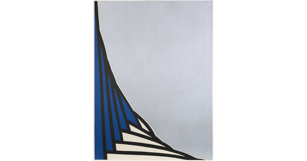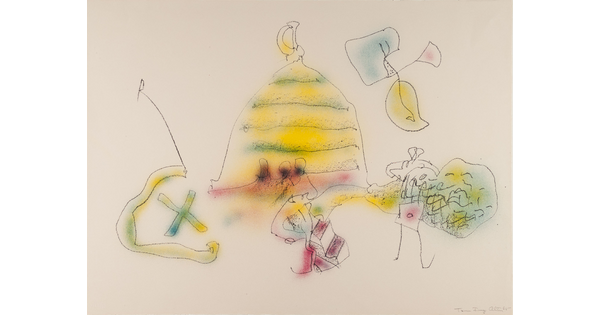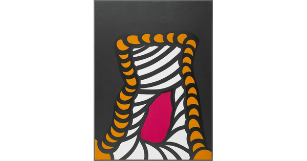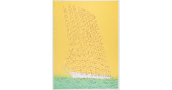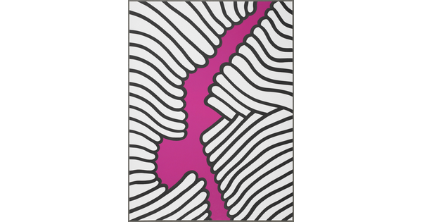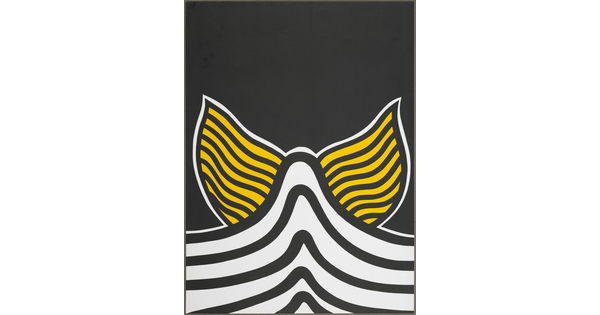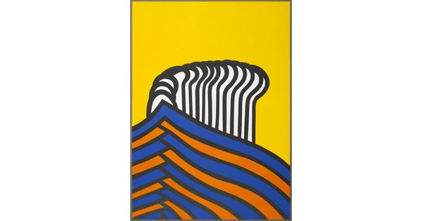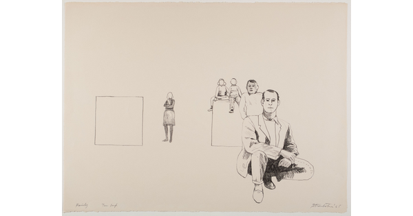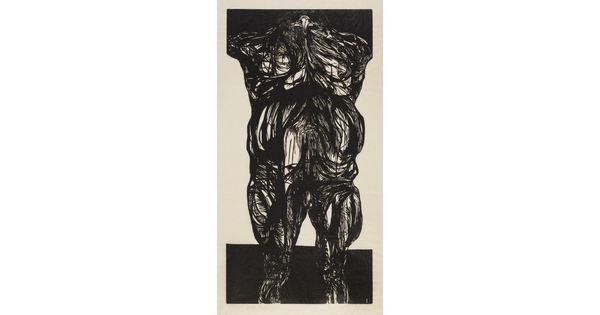 • A black-and-white print of an abstract man, composed of curving thin black lines and cartoonishly warped as if being pulled by a vacuum on one side.