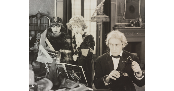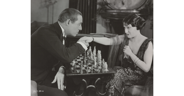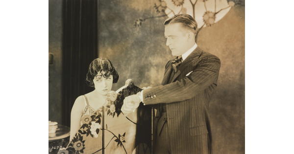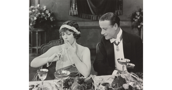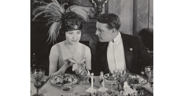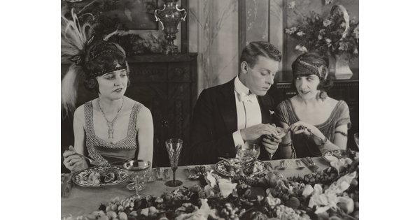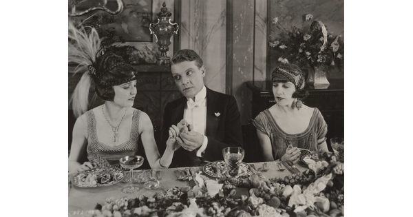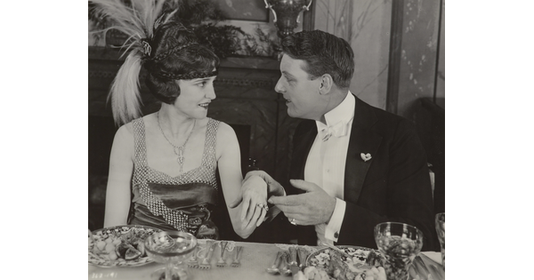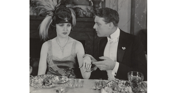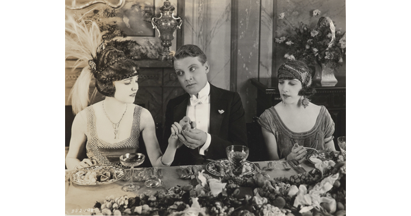 [Forrest Stanley holding Agnes Ayres's hand in formal dinner scene, "Forbidden Fruit"]