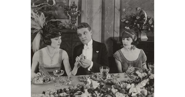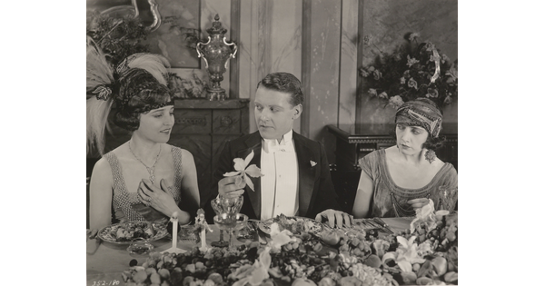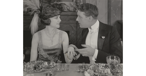 [Forrest Stanley giving flower to Agnes Ayres, formal dinner scene, "Forbidden Fruit"]