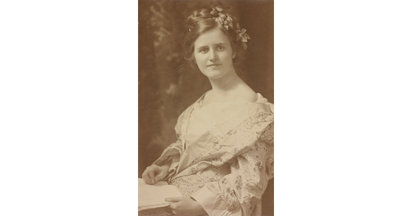 • [Portrait of Clara Sipprell with flowers in hair and book]