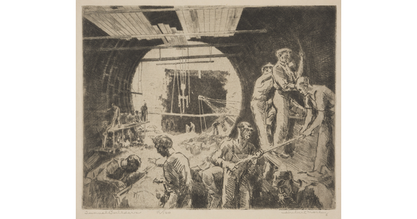 • A black-and-white abstract print of a nude Black man being held by his arms and shoulders by a group of White men.