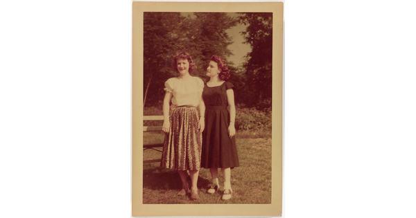 • A color photograph of a White woman wearing a sunhat, floral dress, and white gloves standing in a rose garden.