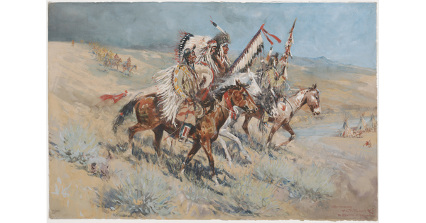 • An oil painting of a cowboy and an Indigenous man on horseback gesturing toward each other in a field of yellowed grass.