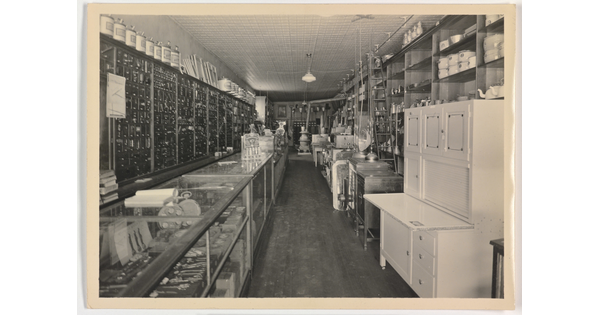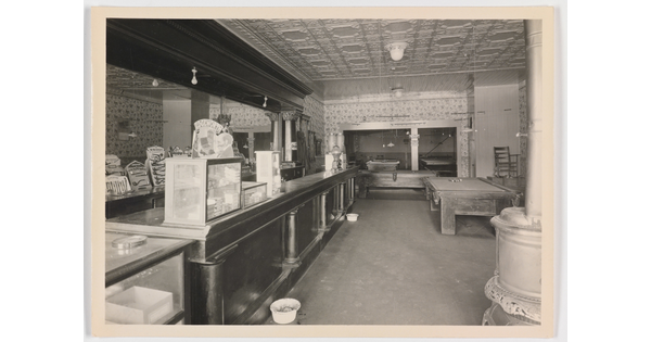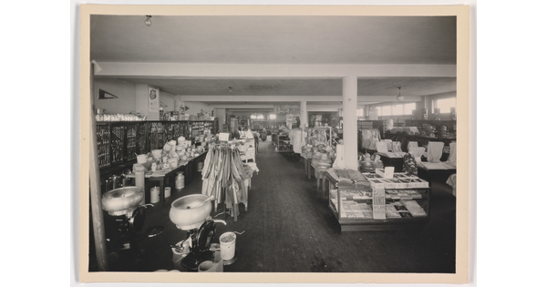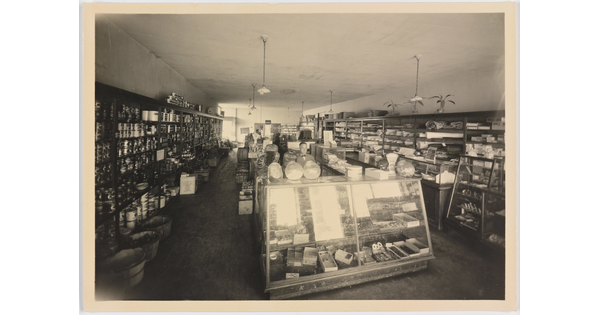• A black-and-white photograph of the interior of a grocery store from the early 20th century.