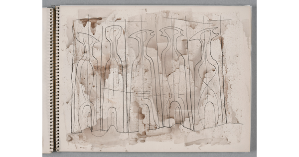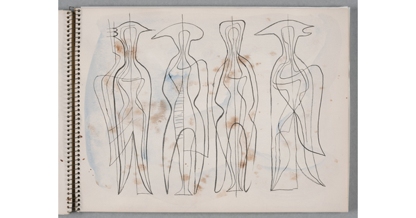 • A group of five separate watercolor studies, four of abstract figures and one a cross-section of a building, on a page of a bound sketchbook.