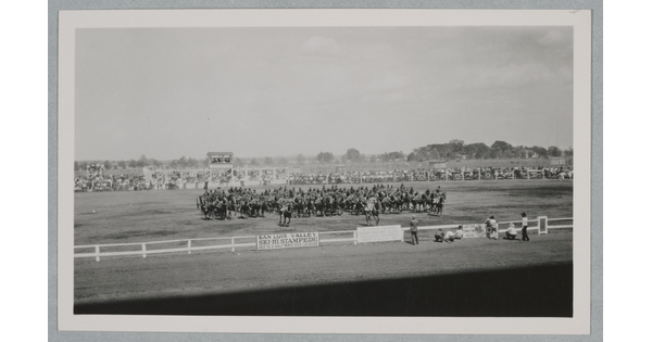 [Horses and riders in arena, San Luis Valley Ski-Hi Stampede, Monte Vista, Colorado]