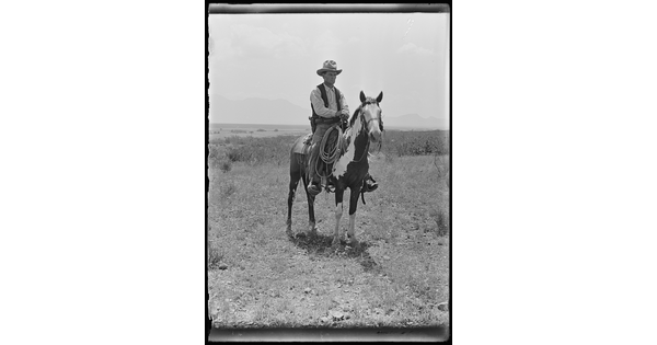 An OR cowpuncher on his paint pony completely outfitted with sixshooter, "double rig", and all. OR Range, Arizona.
