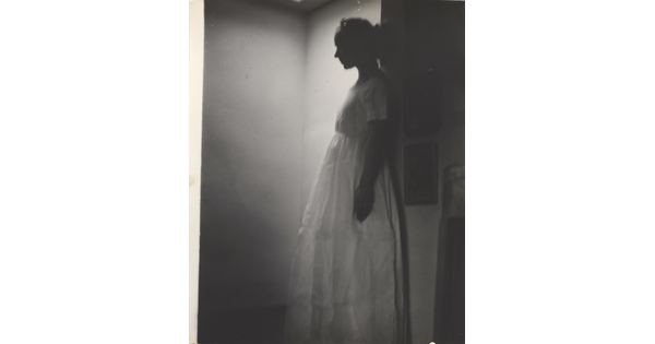 • A black-and-white studio portrait photograph of a White woman behind paper that looks like it has been torn back to reveal her face.