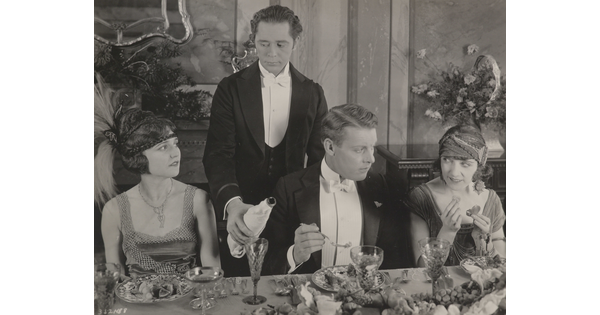 • [Forrest Stanley talking to woman, Theodore Kosloff pouring wine for Agnes Ayres, "Forbidden Fruit"]