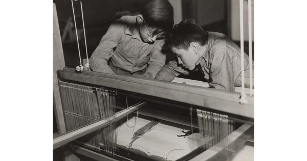 • [Boys working on a loom]