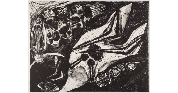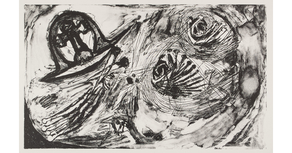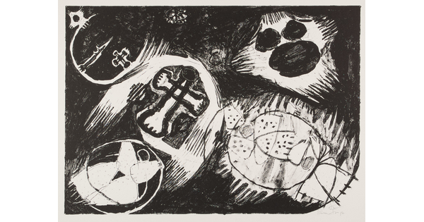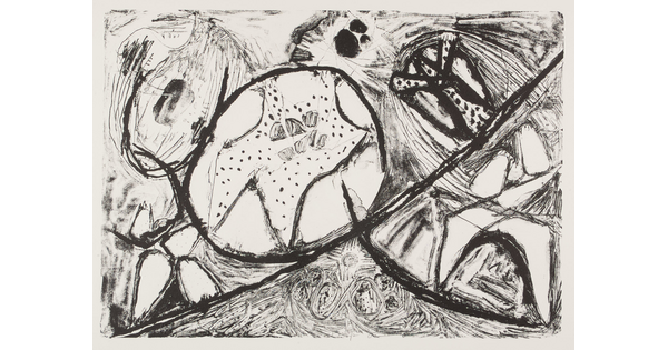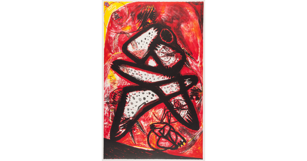 • A color print of thick black lines that form the letter "A" on a bright yellow background with abstracted cloud shapes.