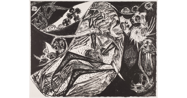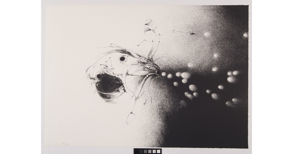 • An abstract color print of three overlapping circles made of radiating black lines, eyes and a mouth in the center, on a tan background.