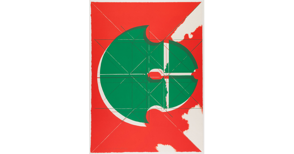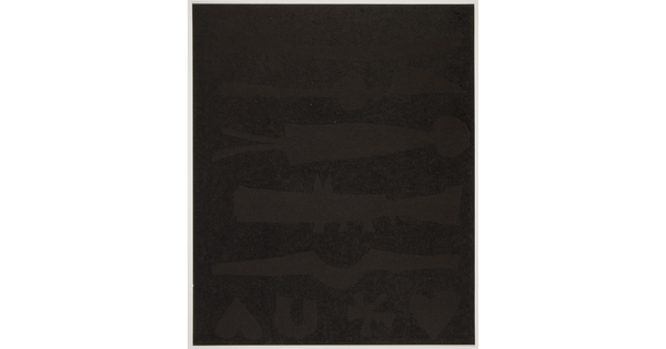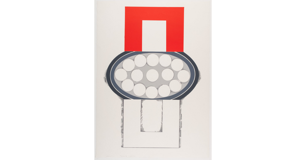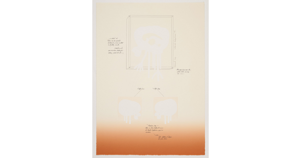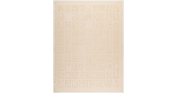 • An abstract color print of a series of geometric shapes and symbols in three levels printed in a very light tan on white paper.
