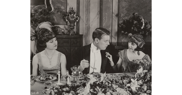 [Forrest Stanley talking to woman, Agnes Ayres looking on, formal dinner scene, "Forbidden Fruit"]