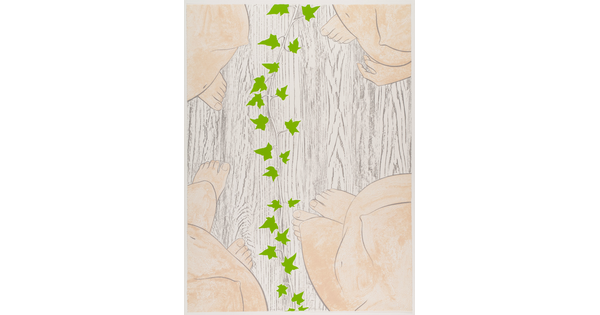 • A faded black-and-white photograph of two wooden crosses marking burial sites, surrounded by leafless trees on a dirt hill.