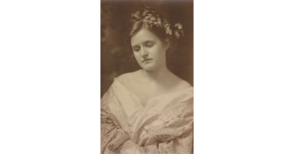 • [Portrait of Clara Sipprell with flowers in hair, looking down]