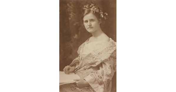 • [Portrait of Clara Sipprell with flowers in hair and book]