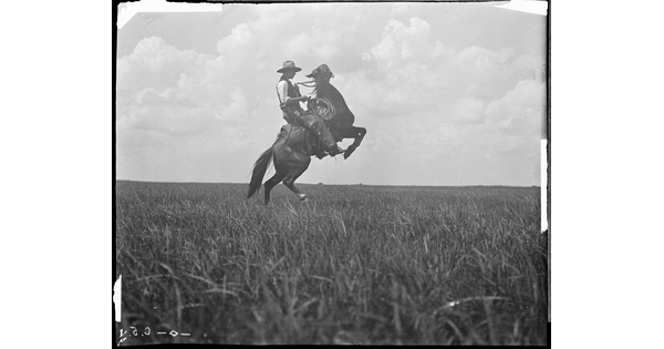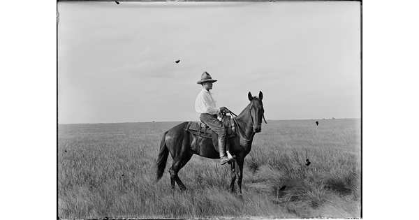 George Pattullo in his tenderfoot days, mounted and ready to ride the Texas plains. JA Ranch, Texas.