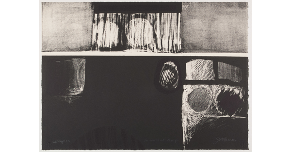 • A black-and-white print of abstract geometric and curved shapes stacked on top of one another.