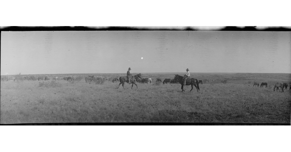 Two cowpunchers dismount during a slack season to play mumble peg in the noonday sun. Matador Range, Texas.