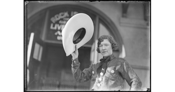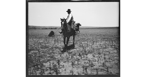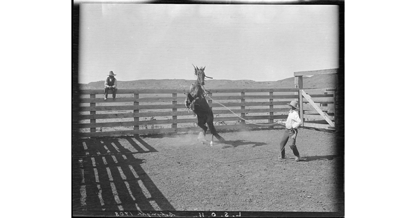 A Shoe Bar cowpuncher trying to approach his horse that is pitching in roundup camp. Shoe Bar Ranch, Texas.