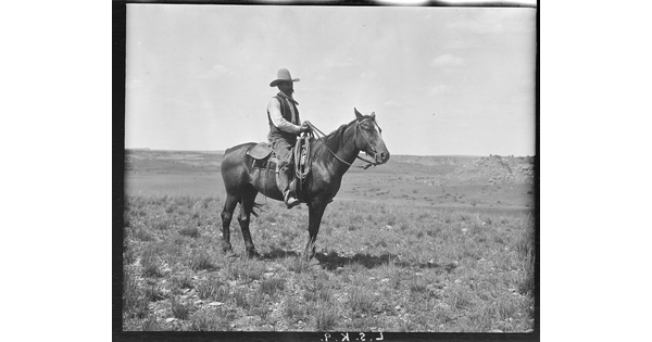 • One of the LS cowpunchers sitting easy in the saddle. LS Ranch, near Tascosa, Texas.