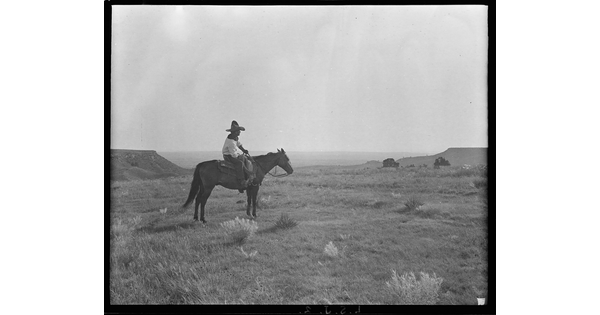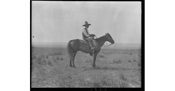 • Edwin Sanders, cousin of the photographer, Erwin E. Smith, mounted on the side of a steep hillside. Three Circles Ranch, Texas.