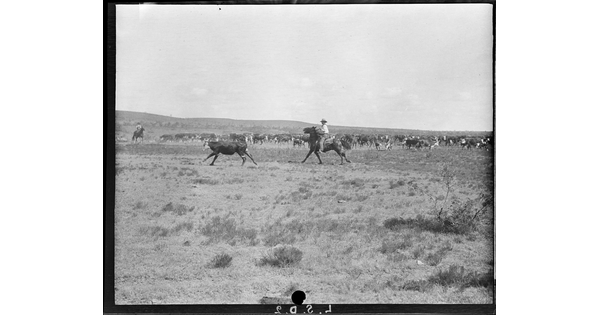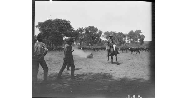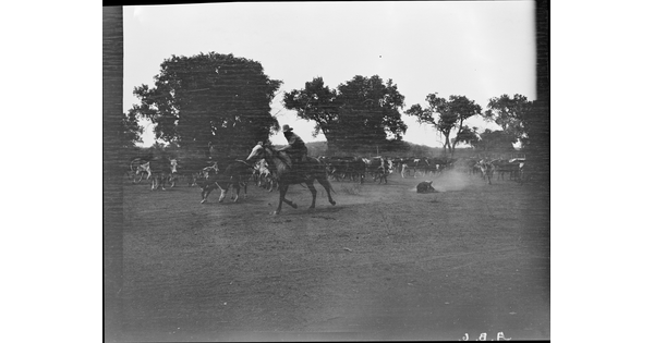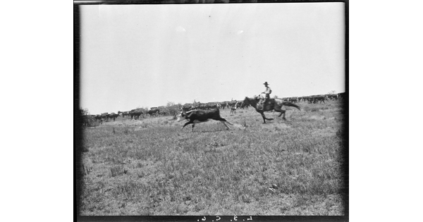 • [JA cowpuncher pulling a calf from the herd for branding, JA Ranch, Texas]