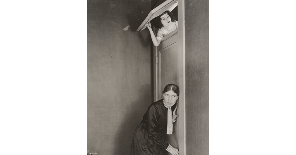 [Woman listening through door, watched by girl looking through transom window, "Forbidden Fruit"]
