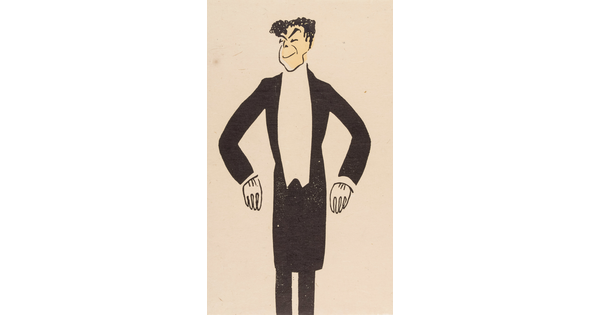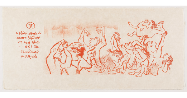 • A black-and-white print of an abstract, almost round shape outlined in black, the left half black and the right half white.